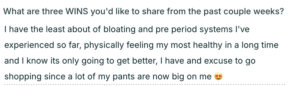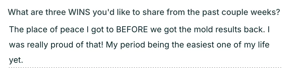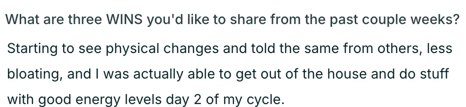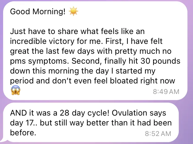 "My mental health is NIGHT & DAY from what it was last year and it shows in every area of my life. I have so much more clarity and confidence. Everyone in my life started noticing my glow both physically and in my energy. All of the girls at work especially, and hearing that was so confirming for me! I feel like I have my spark back again, like I have ME back. I have my sense of humor back, a calm nervous system, and my body back. I'm actually sleeping through the night now, no 3am wakeups unless close to my period! Nearly zero PMS symptoms."
